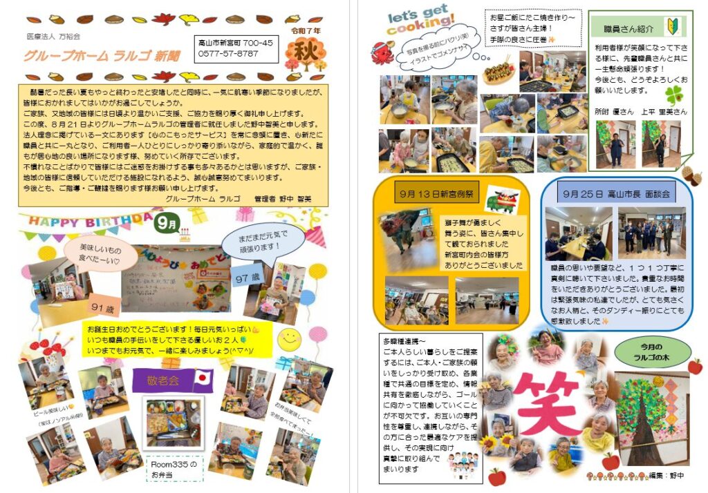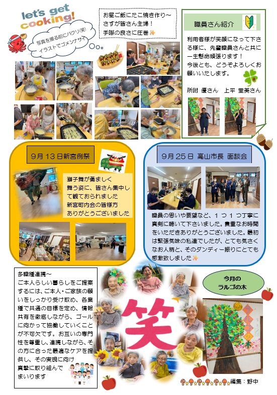 今回の「グループホームラルゴ秋号」では新しい管理者からのご挨拶から始まり、敬老会♪たこ焼きパーティーの様子などを掲載しています。9月には高山市長のご訪問があり、ラルゴ職員と高山市長との面談会が行われました!職員の思いや要望を一つ一つ丁寧に聴いて下さり、職員も初めは緊張気味でしたが、気さくなお人柄にとても話しやすく貴重な時間を過ごすことができました(#^^#)