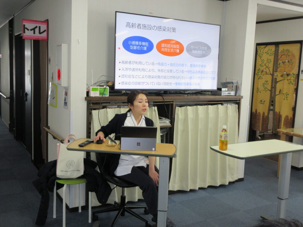 久美愛厚生病院の感染管理認定看護師の方を講師でお招きし、ウイルスが人から人へ感染が広がらない為に、日頃出来ることを学びました。