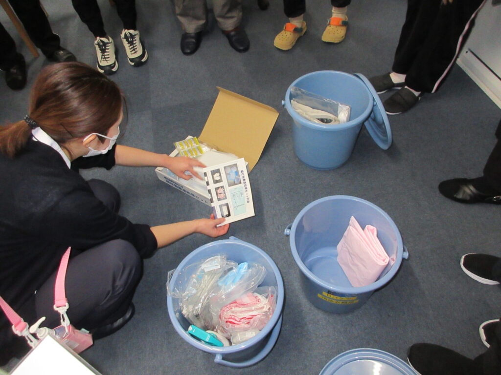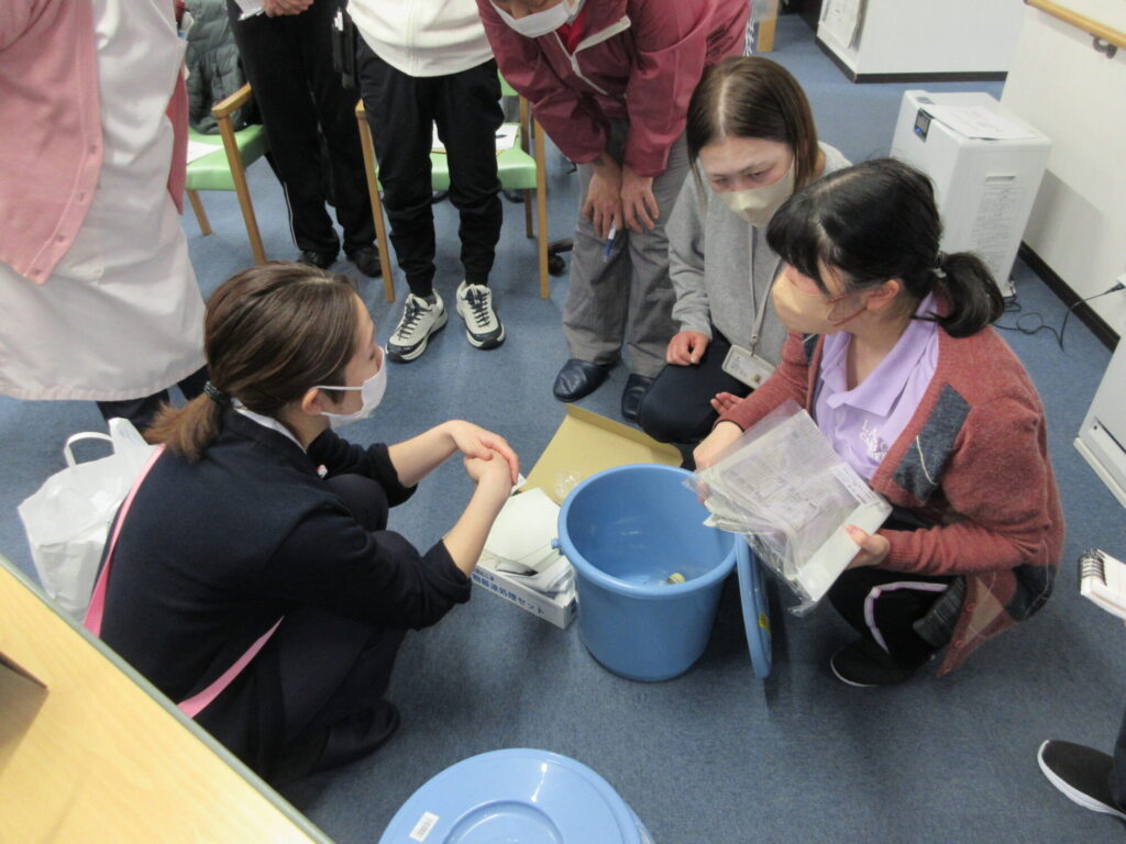 各事業所のノロウイルス汚物処理セットの物品確認と処理工程を確認しました。