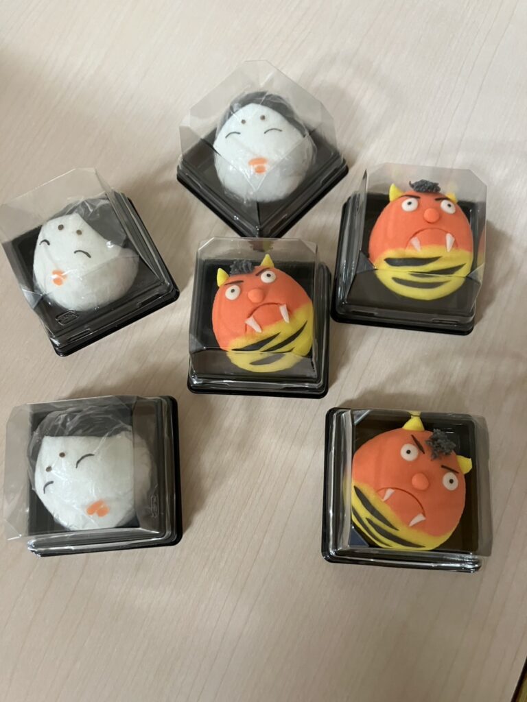 思う存分、豆(カラーボール)を投げた後の利用者様は良い顔してみえます!😄本日のおやつは❛稲豊園❜さんの鬼とおかめの和菓子です!♪