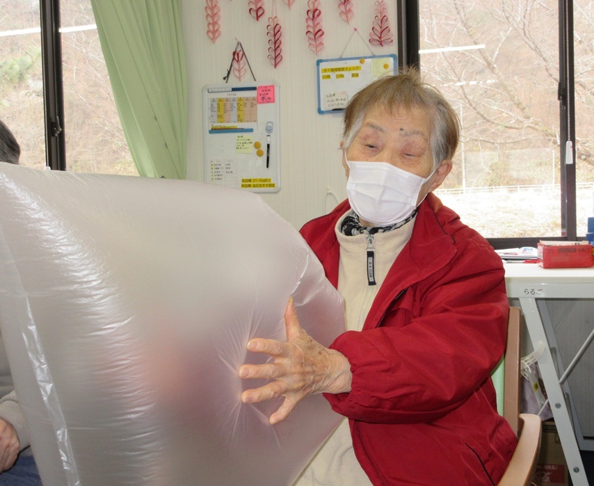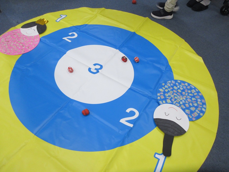 レクリエーションはお手玉飛ばしゲームをしました。袋を膨らませ、くぼみを作ってお手玉を乗せ、袋を押すとお手玉が飛び出すので、床に引いた的に落ちれば点数がもらえ、各自点数を競って楽しみます。的を目がけて力強く押すと大きく飛び、反対に少しだけ押すと少ししか飛びません。力加減が難しく、思わぬ方向に飛んで行ってしまうたびに、みんなで大盛り上がりでした。😆🤣