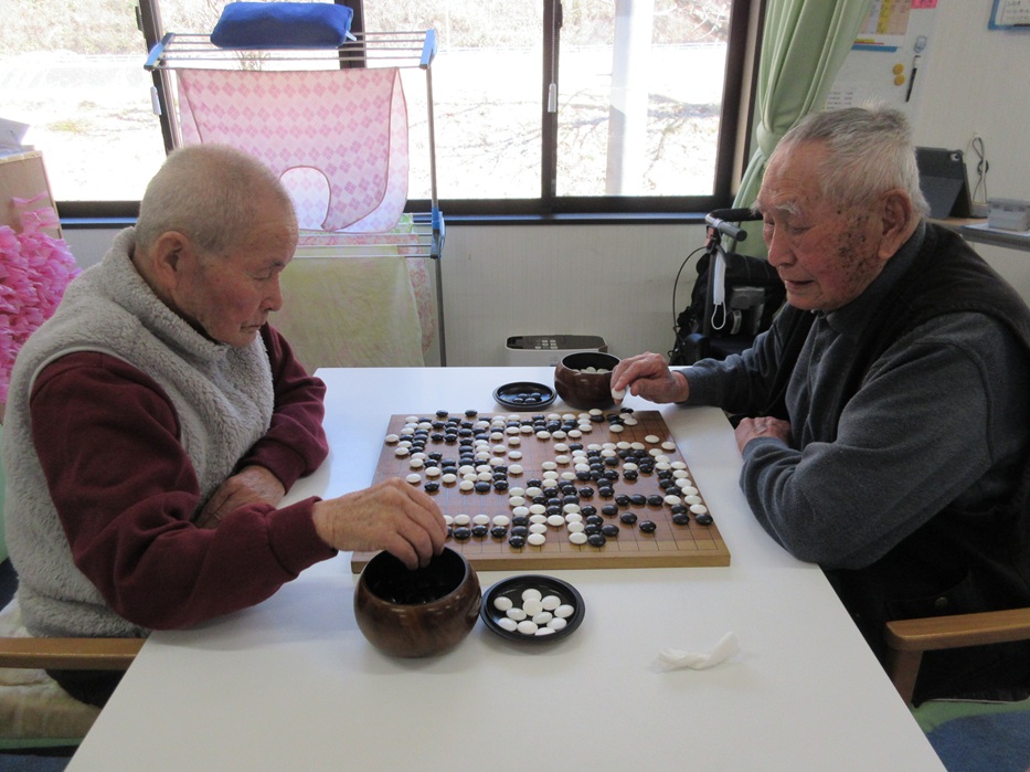 午前中は入浴等がありますが、午後からの時間の過ごし方はお一人お一人それぞれです。囲碁をされる方同士、囲碁を楽しまれたり、工作に取り組まれる方も見えます。暖かい日は施設の周りを散歩に出られる方も見えます。