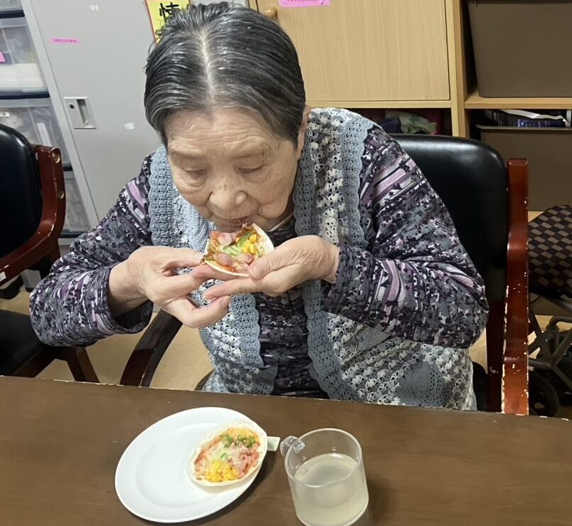 準備が整ったら、職員がトマトソースを塗った皮を手に取り思い思いに好きな物をトッピングしていきます。🍅